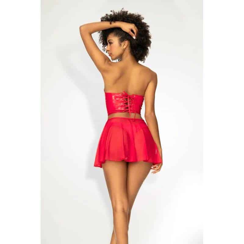Vinyl with a romantic twist. A versatile two piece red set that turns into a babydoll. Sweetheart neckline vinyl bustier with a lace-up back, matching thong and a removable sheer skirt.