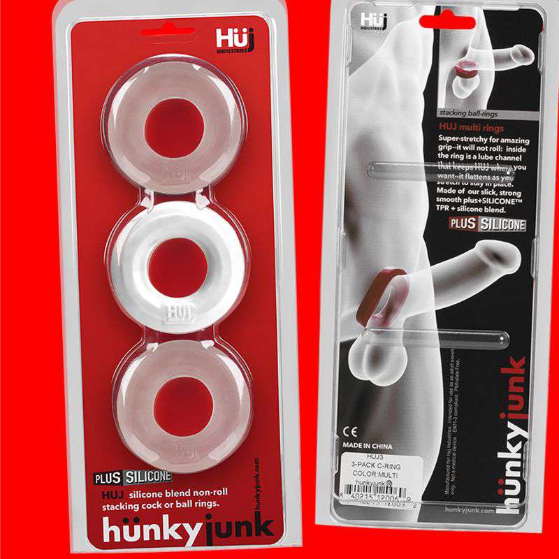 Hunky Junk 3 c ring is our take on a basic ring most guys will want to use and use often. This 3 pack is the best option for customers that use c rings often. Our history shows this size ring gets used multiple ways, often more than one at a time. HUJ ring is a c ring and a ball ring, some guy’s stack them for more stretch or for more grip.