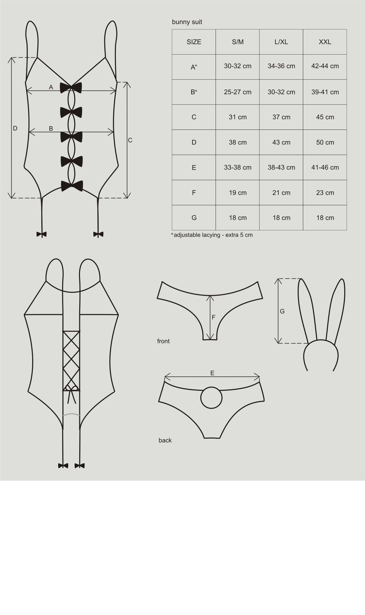 - soft, elastic fabrics (top, panties, ears: 88% polyester, 12% elastane; stockings: 80% nylon, 20% elastane)