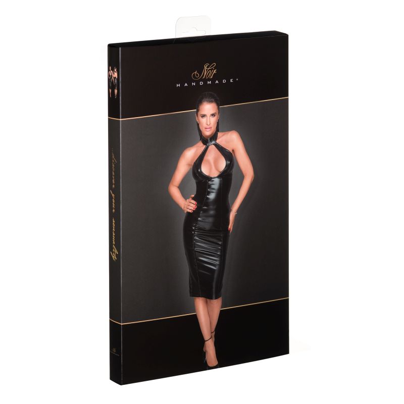 Dress featuring amazing cleavage and decorative stone ribbon along the right side. The hidden zipper and hook fasteners on the collar allow for more comfort when taking the dress on and off.