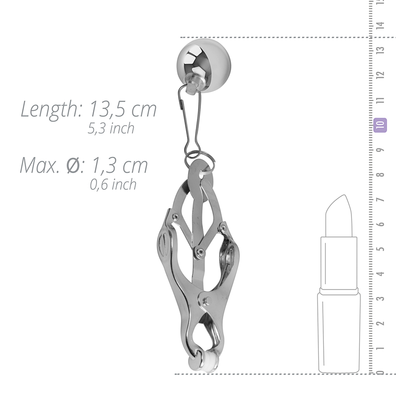 These beautiful metal nipple clamps from the EasyToys collection are ready to stimulate your most sensitive spots. The Japanese clover clamps are made of strong and durable metal and have soft protection caps on the tips. The small balls at the bottom weigh 44 grams each and pull on the clamps for a stimulating sensation. This makes the nipple clamps indispensable in the collection of every bondage enthusiast.