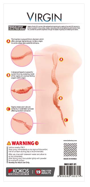 Design mimics a virginal vagina, features  folds, creases, nubs along with strong tightening and insertion entrance.