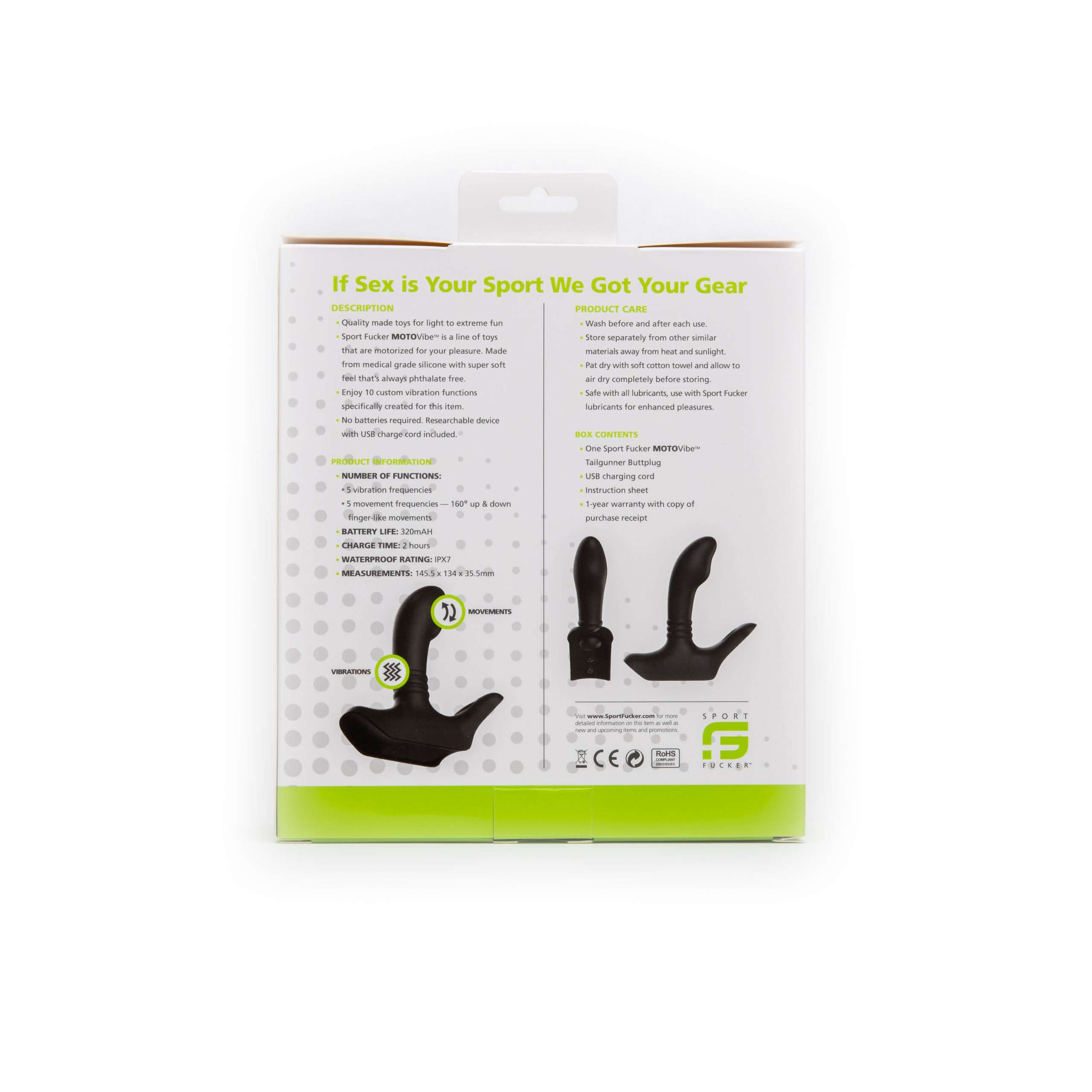The first plug in the Sport Fucker MOTOVibe line, the Tailgunner features five vibration frequencies and five movement patterns on its insertable tip. The small circle on its tail enhance the vibration sensations felt along the taint. This plug is made from high quality, medical grade material that is both waterproof and phthalate free. Despite the power the Tailgunner packs, no batteries are required—it’s quickly and easily rechargeable with the included USB cord.