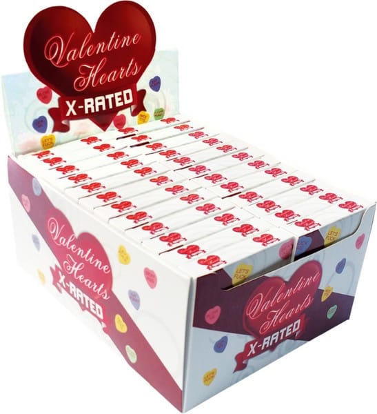 X-Rated Valentine Heart Candies with saying including: LICK ME – LET'S FUCK – BLOW ME – NICE TITS – EAT PUSSY – ASSHOLE – DOGGY STYLE – SEXY ASS.